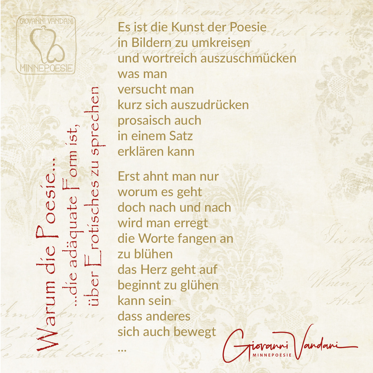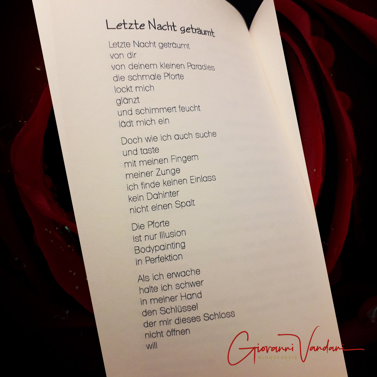 Dieses Gedicht war der Beginn - die spontane Niederschrift eines realen Traumes, der emotional sehr intensiv war und wohl viel aussagt über den Zustand von Giovannis Beziehung mit seiner Frau zu jenem Zeitpunkt. Und damit startete ein Flow, der in Wellenbewegungen nunmehr bereits vier Jahre lang anhält.